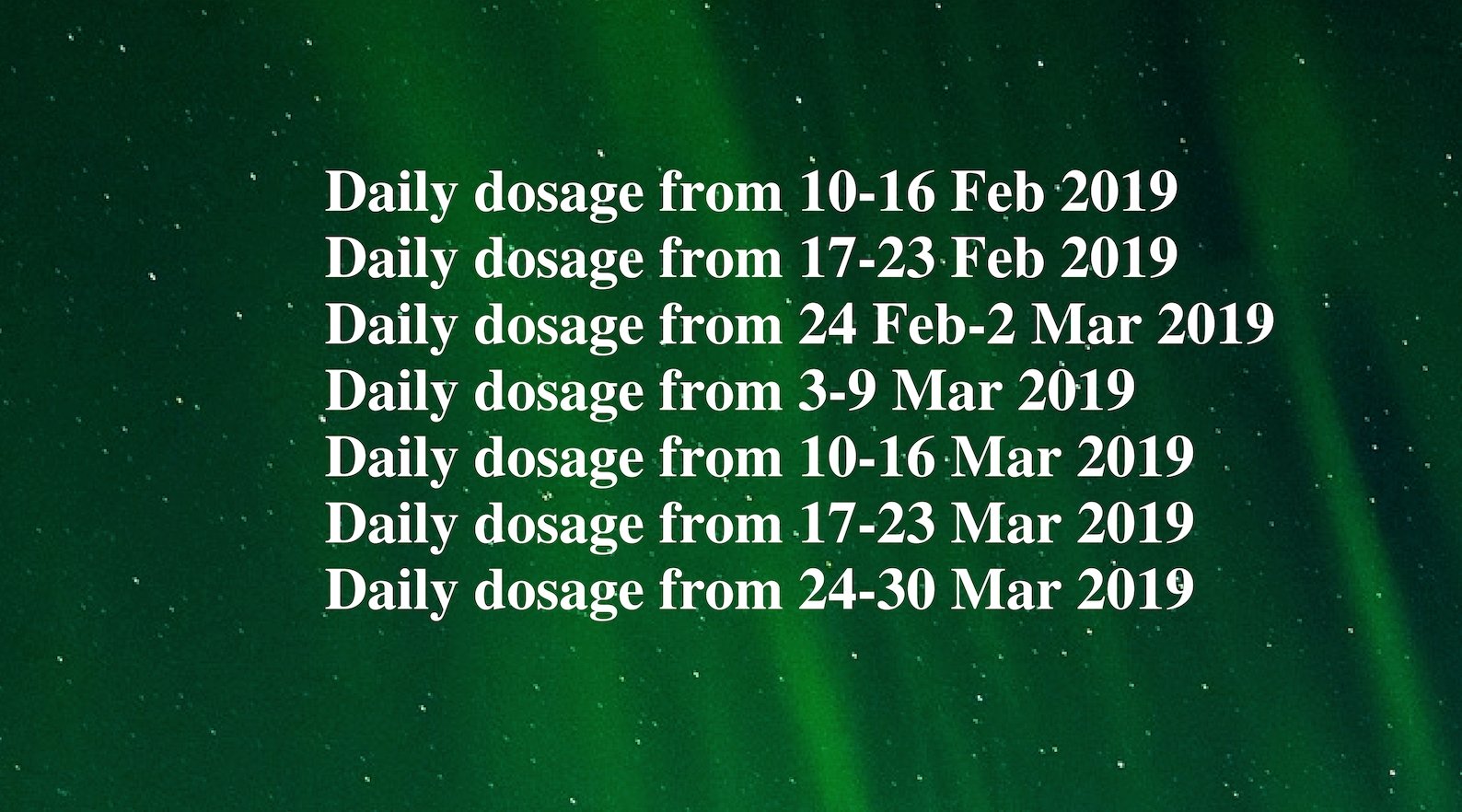 Daily dosage from 10-16 Feb 2019 Daily dosage from 17-23 Feb 2019 Daily dosage from 24 Feb-2 Mar 2019 Daily dosage from 3-9 Mar 2019 …